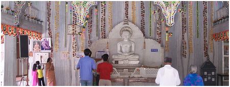held in the temples, fasts and charities are observed, The Jains observes religious events on this day. |